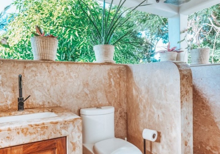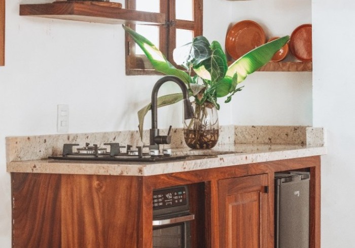 On the lookout for a sustainable luxury hotel? Villa Ama Studio blends planet-positive comfort with vintage artistry. Thoughtfully crafted from eco-friendly materials, it offers an inviting retreat for couples, solo travelers, or remote workers. A cozy living space and spa-inspired bathroom set the stage for rest and renewal.